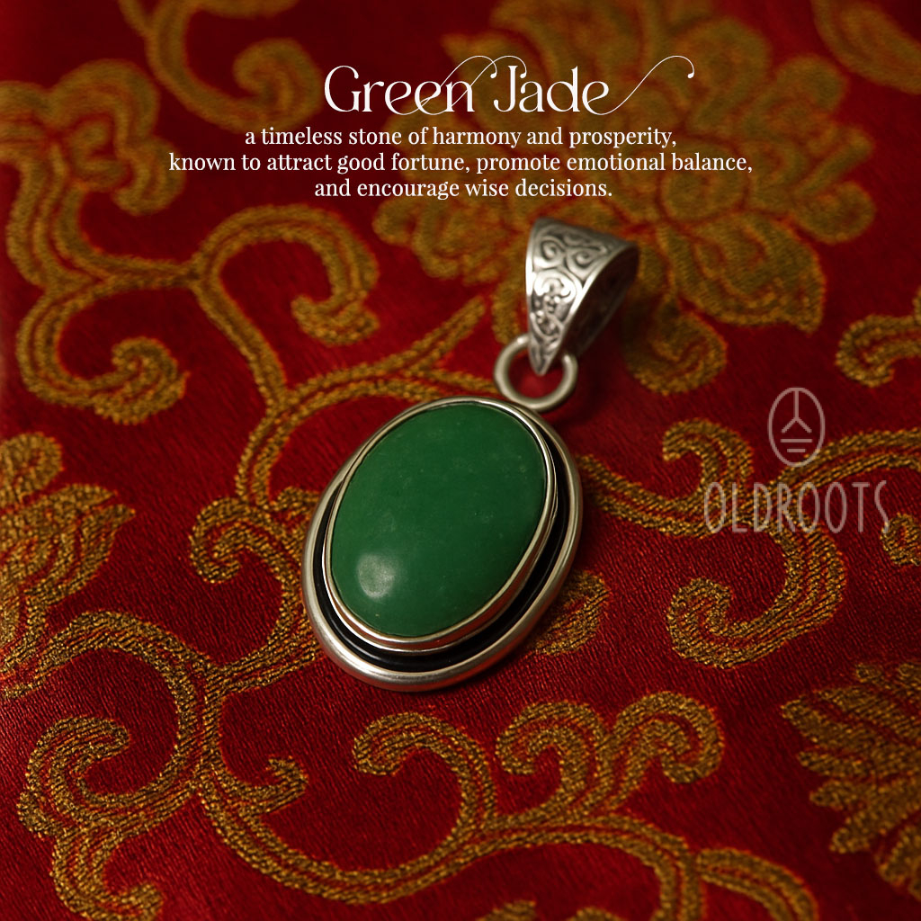 Vibrant oval green jade cabochon in sterling silver bezel with filigree bail. Attracts fortune, balances emotions, inspires wisdom. Includes chain; ethical & hypoallergenic.