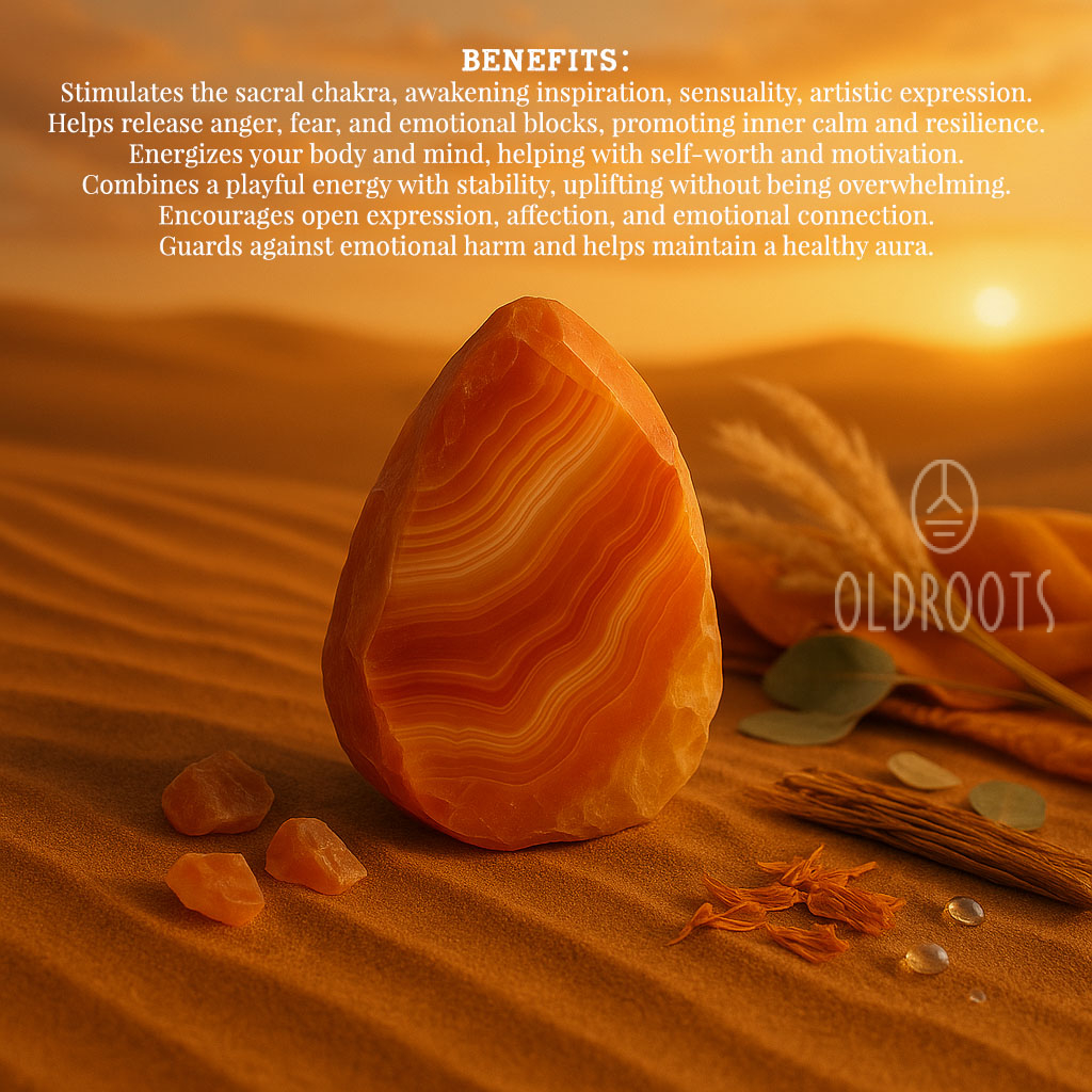 The orange agate gemstone radiates warmth and positivity, enhancing creativity and motivation.