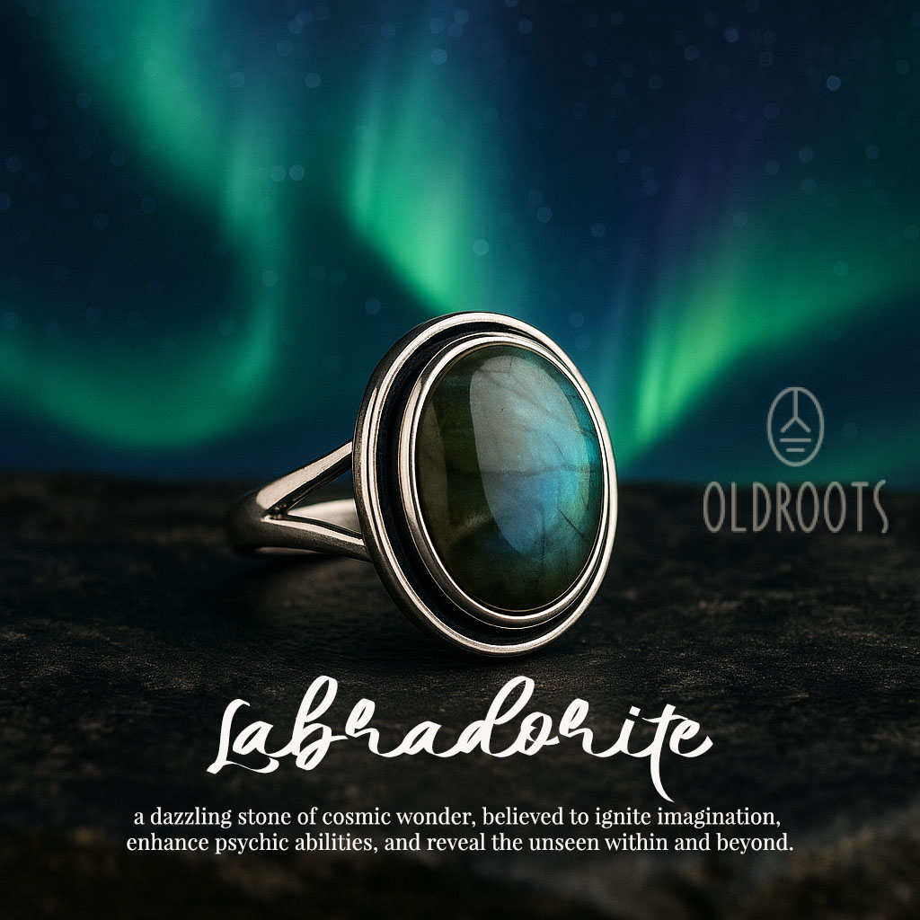 Step into the mystical with our Oval-Shaped Labradorite Alloy Ring, a captivating blend of beauty and magic.