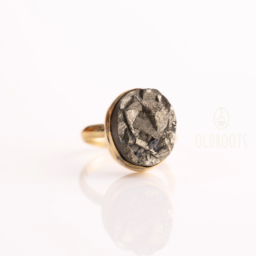 Unveil the mystique of our Oval-Shaped Raw Pyrite Alloy Ring. Featuring an adjustable design, this ring showcases the golden gleam of natural pyrite gemstone within a geode-inspired setting. Pyrite is renowned for its protective energy and manifestation properties. Wear this versatile piece as a symbol of strength and abundance, letting the raw beauty of pyrite captivate and inspire.